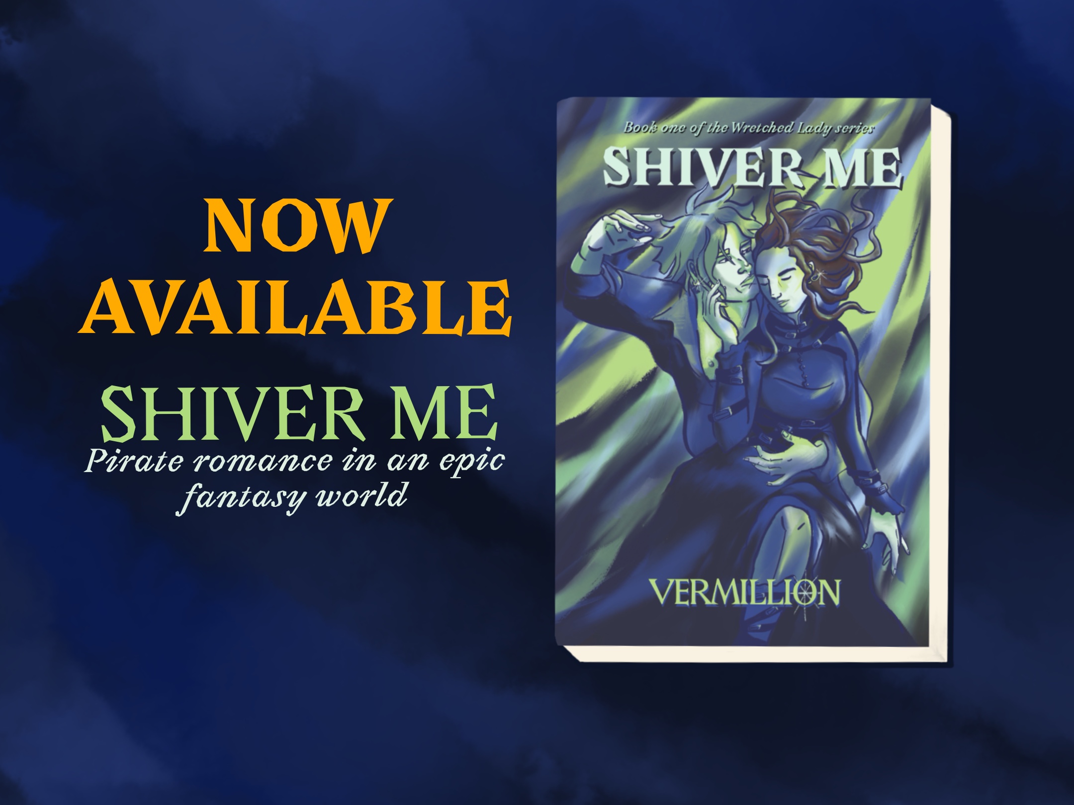 Vermillion would be far happier on the deck of the Wretched Lady than sitting in front of her laptop in Los Angeles. Shiver Me is her debut novel, but she has plenty of fantastical tales with charming bisexual characters up her sleeve. When she’s not scheming over a story, you’re just as likely to find her on a walk in a gnarled wood as in a dark bar with a book in her hand.